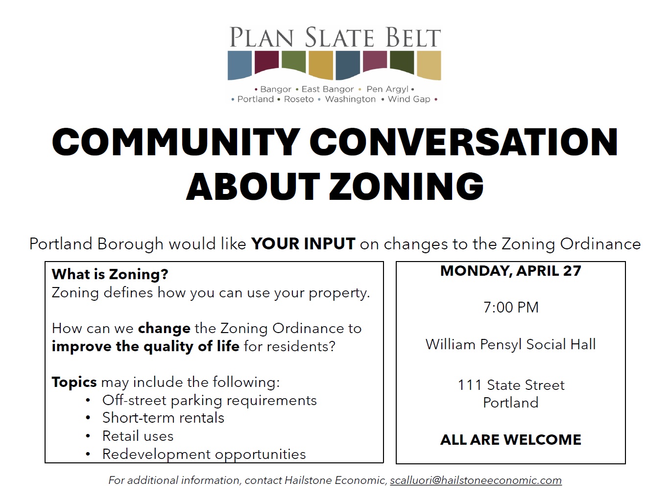 Please join us for a conversation about the zoning ordinance and map on Monday, April 27 at 7:00 PM in the William Pensyl Social Hall, 111 State Street, Portland. If you have any questions, please contact our consultant at scalluori@hailstoneeconomic.com.